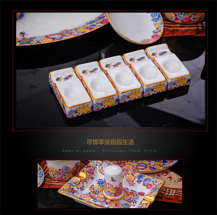 90頭金地萬花餐具,一個(gè)宮廷湯煲,一個(gè)十二寸魚盤,一個(gè)10寸平盤,一個(gè)10寸月光盤,一個(gè)9寸平盤,一個(gè)9寸湯盤,四個(gè)8寸平盤,四個(gè)8寸湯盤,四個(gè)6寸高腳面碗,十個(gè)4.5寸飯碗,十個(gè)4寸湯碗,十個(gè)7.5寸淺盤,十個(gè)4寸小蝶,十個(gè)筷架,十個(gè)天鵝小勺,一個(gè)天鵝大勺,一個(gè)花籃,兩個(gè)胡椒瓶,一個(gè)牙簽筒,一個(gè)大煙灰缸,一個(gè)雙層水果盤,一個(gè)美鵝,一個(gè)毛巾碟,兩個(gè)燉盅。
