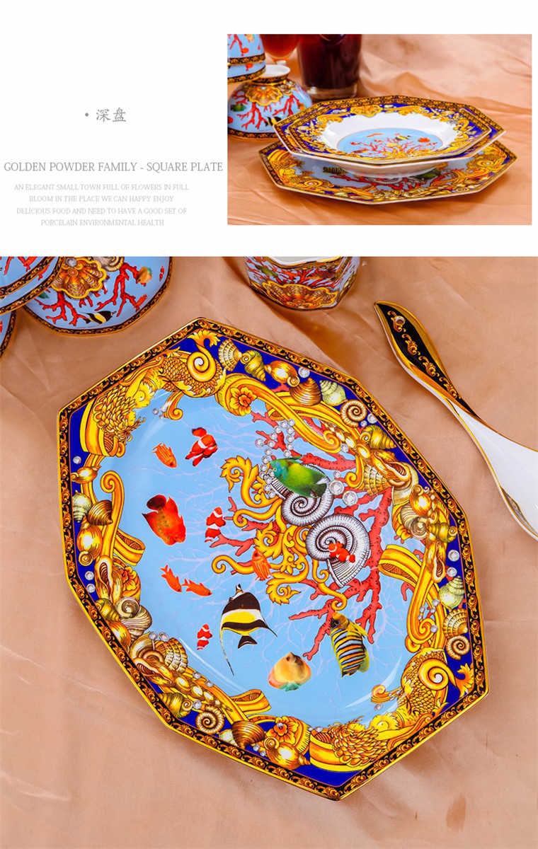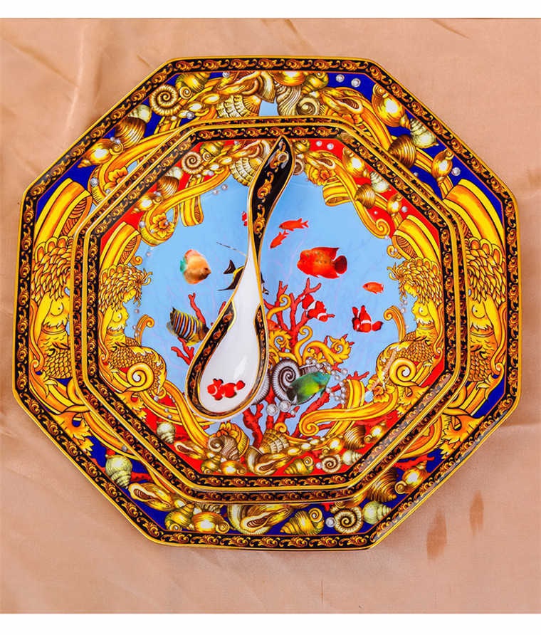 85頭釉中彩海底世界,一個湯煲,一個飯勺,一個魚盤,一個10.5寸平盤,一個10.5寸月光盤,雙層果盤一個,一個大煙缸,一個小煙缸,二個調(diào)料罐,一個牙簽筒,四個面碗,十個4.5寸飯碗,十個三寸調(diào)味碟,十個4寸湯碗,十個調(diào)羹,十個7寸骨碟,十個八寸盤,十個筷子架。
