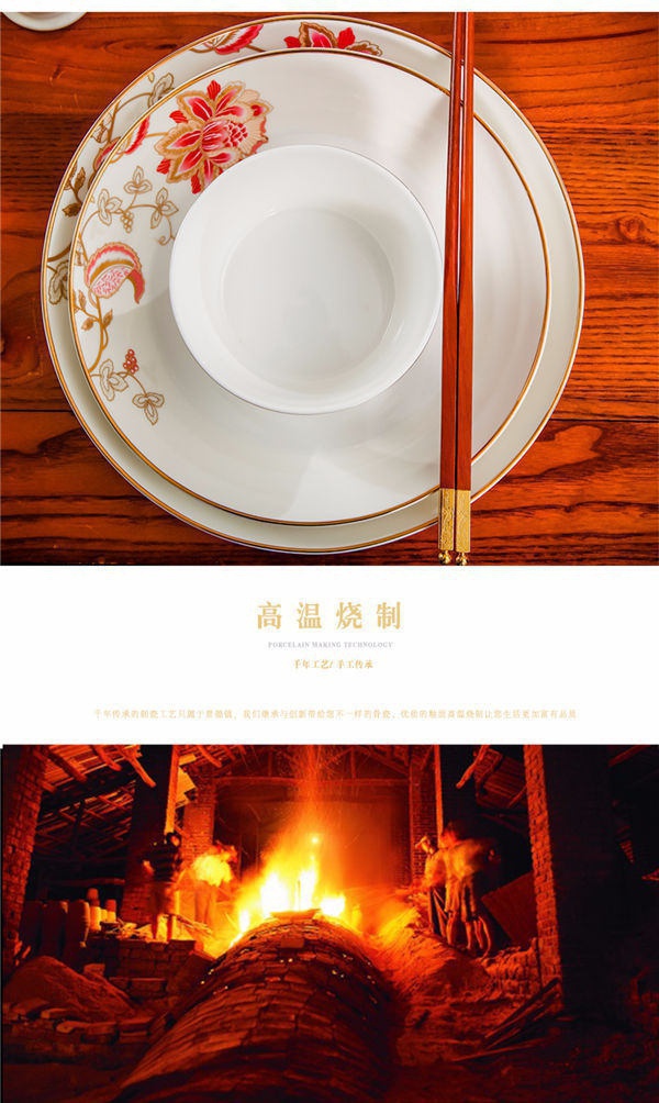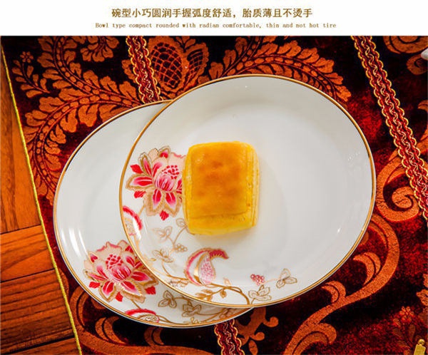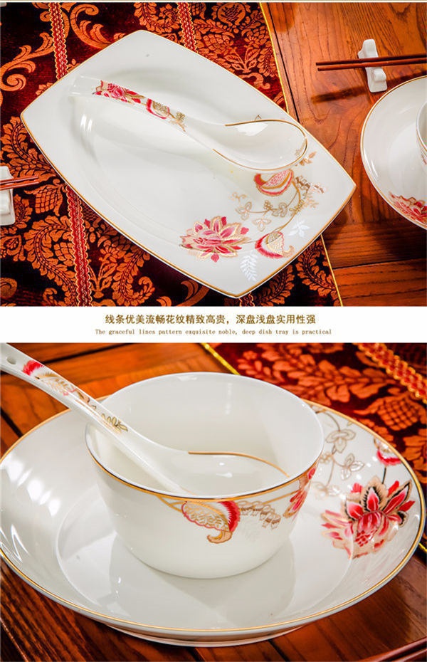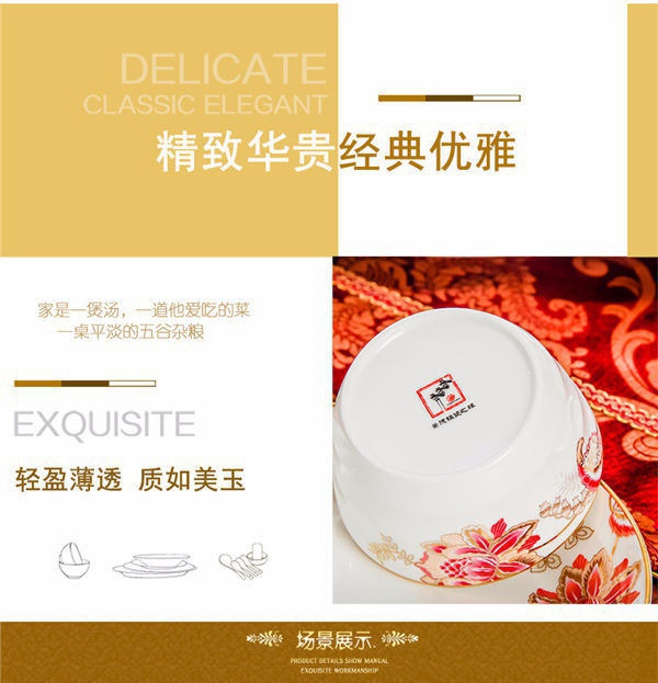 65頭醉花吟,一個湯煲,一個魚盤,一個大飯勺,一個大湯碗,一個牙簽筒,六個面碗,四個三寸碟,十個盤子,十個4.5寸飯碗,十個五寸骨碟,十個調羹,十個筷子架。