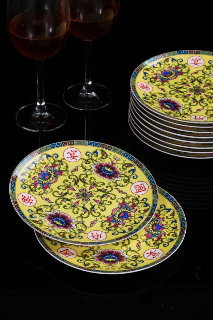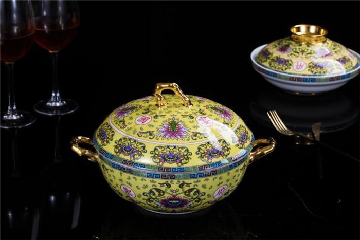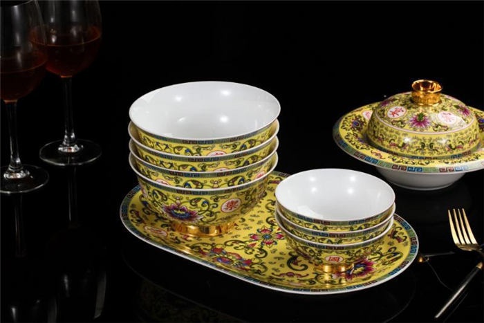 十個碗,7寸骨盤十塊,盤子十塊,小勺十個,筷子架十個,面碗四個,魚盤一個,大圓盤一塊,湯煲一個,合和器2套四塊,燉盅2套四個,果盤1套二個,大飯勺一個。