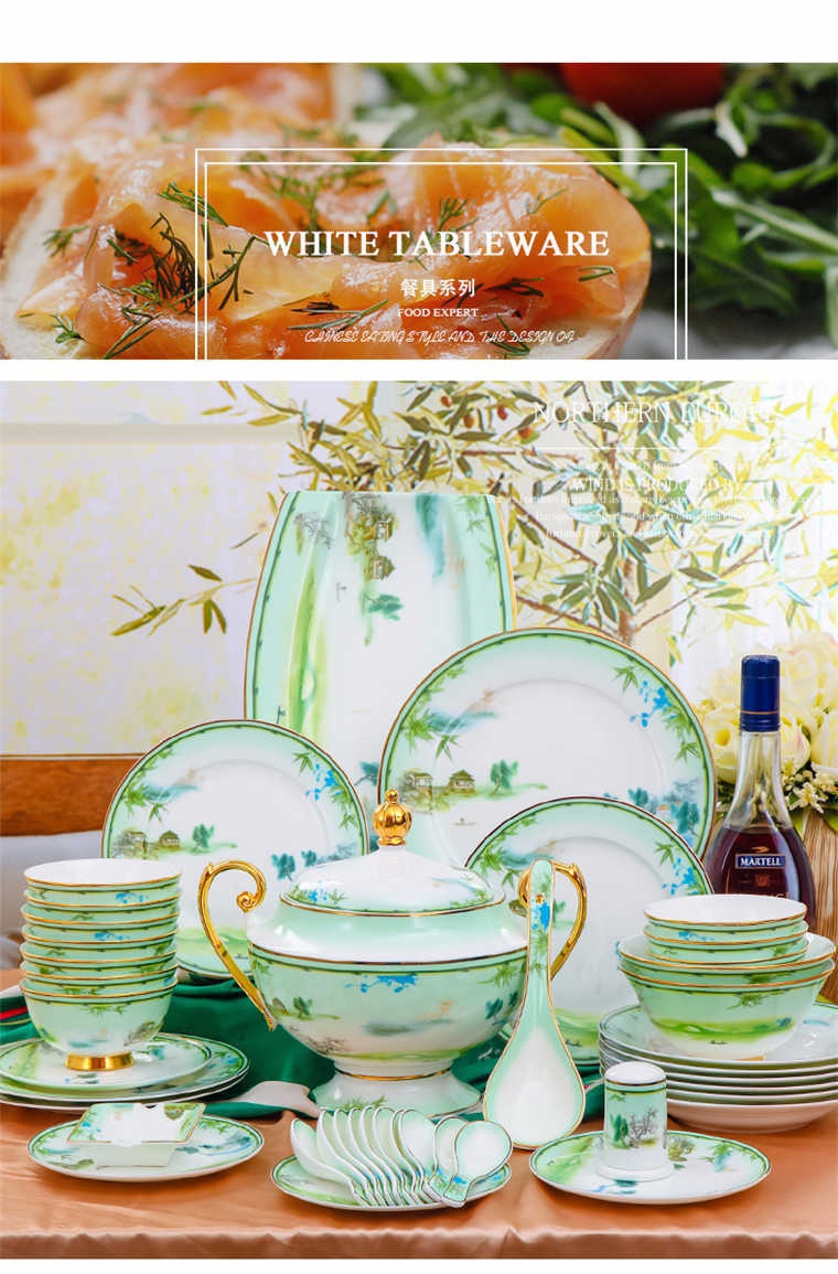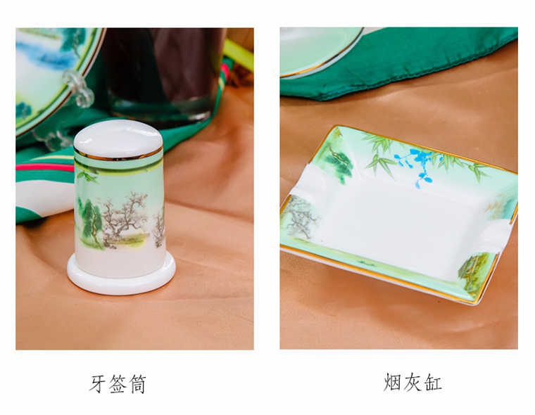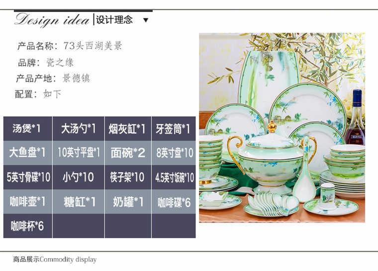 73頭西湖美景,一個(gè)湯煲,一個(gè)大湯勺,一個(gè)煙缸,一個(gè)牙簽筒,一個(gè)魚(yú)盤(pán),一個(gè)10寸平盤(pán),兩個(gè)面碗,十個(gè)8寸盤(pán),十個(gè)5寸骨碟,十個(gè)4.5寸飯碗,十個(gè)小勺,十個(gè)筷子架,一個(gè)咖啡壺,一個(gè)糖缸,一個(gè)奶罐,六個(gè)咖啡杯,六個(gè)碟。